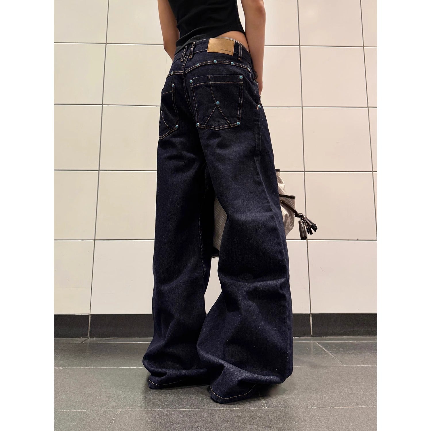 Summer new American Retro denim primary color turquoise machete jeans for women A- line straight wide-leg pants